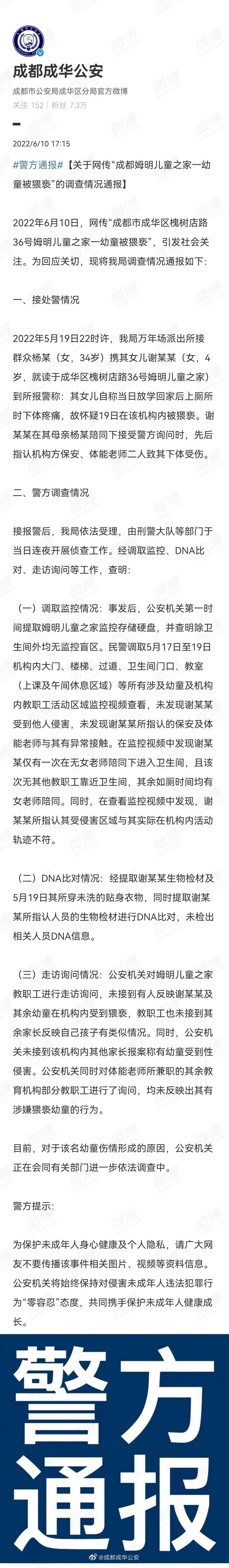 6月10日,网传“成都市成华区槐树店路36号姆明儿童之家一幼童被猥亵”,引发社会关注。@成都成华公安 微博10日发布《关于网传“成都姆明儿童之家一幼童被猥亵”的调查情况通报 》: