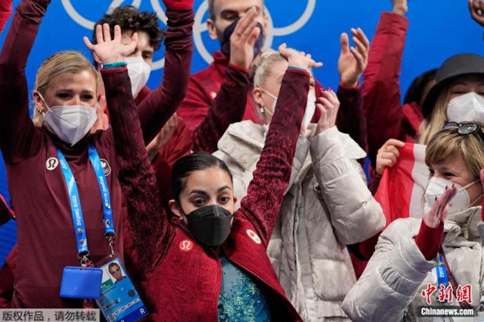 2月7日,加拿大花滑选手玛德琳·席萨斯与团队在得知分数后欢呼。