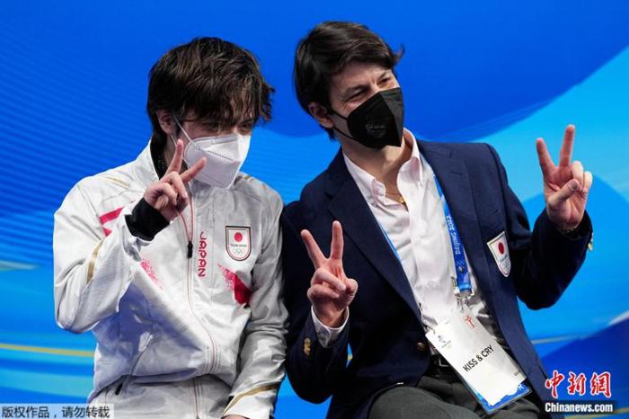 2月8日,日本花滑选手宇野昌磨和教练兰比尔在等分区,兰比尔胸前佩戴写有“Kiss&Cry”的牌子。