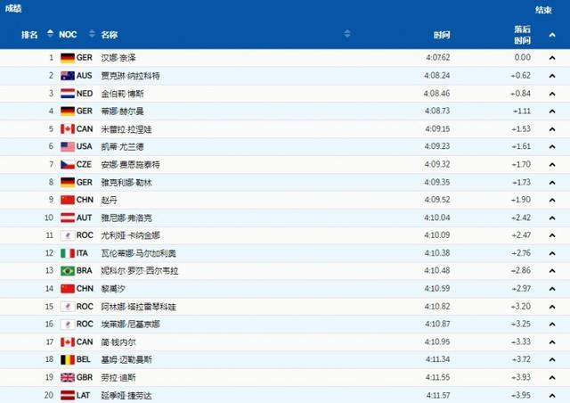 赵丹第12位出场,本轮滑出1:02.33的成绩,4轮过后的成绩为4:09.52,最终位列第9。