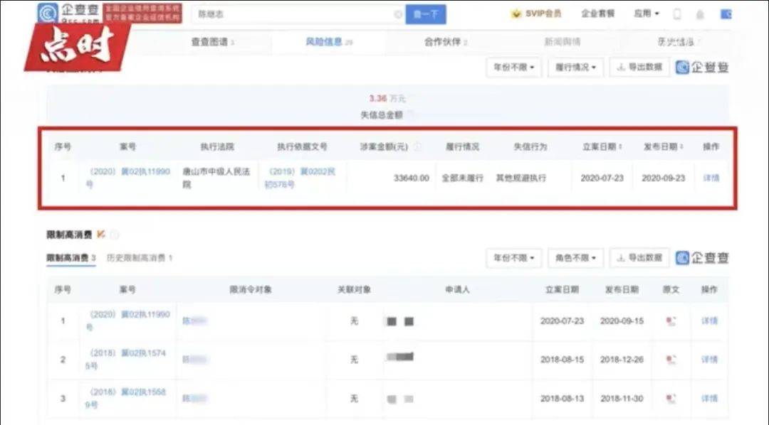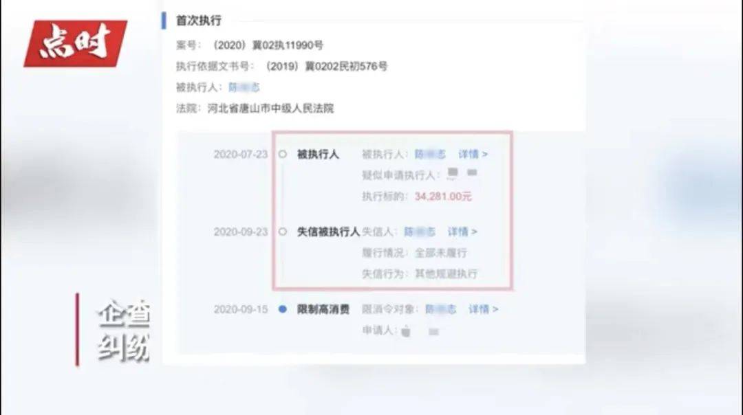 资料显示,陈某志于2020年因不当得利纠纷被河北省唐山市中级人民法院强制执行,执行标的34281元。后因全部未履行,法院将其列为失信被执行人,并被限制高消费。