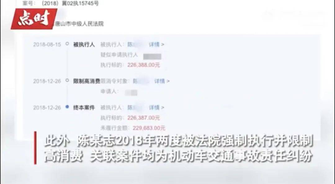 此外,陈某志2018年两度被法院强制执行并限制高消费,关联案件均为机动车交通事故责任纠纷。
