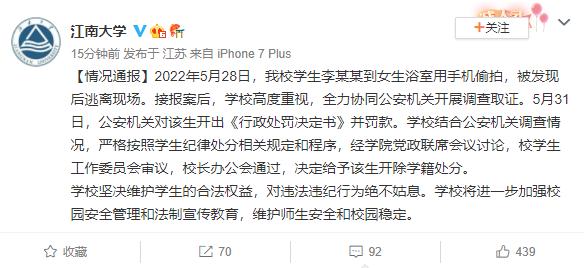 江南大学官方微博消息 2022年5月28日,我校学生李某某到女生浴室用手机偷拍,被发现后逃离现场。接报案后,学校高度重视,全力协同公安机关开展调查取证。5月31日,公安机关对该生开出《行政处罚决定书》并罚款。学校结合公安机关调查情况,严格按照学生纪律处分相关规定和程序,经学院党政联席会议讨论,校学生工作委员会审议,校长办公会通过,决定给予该生开除学籍处分。