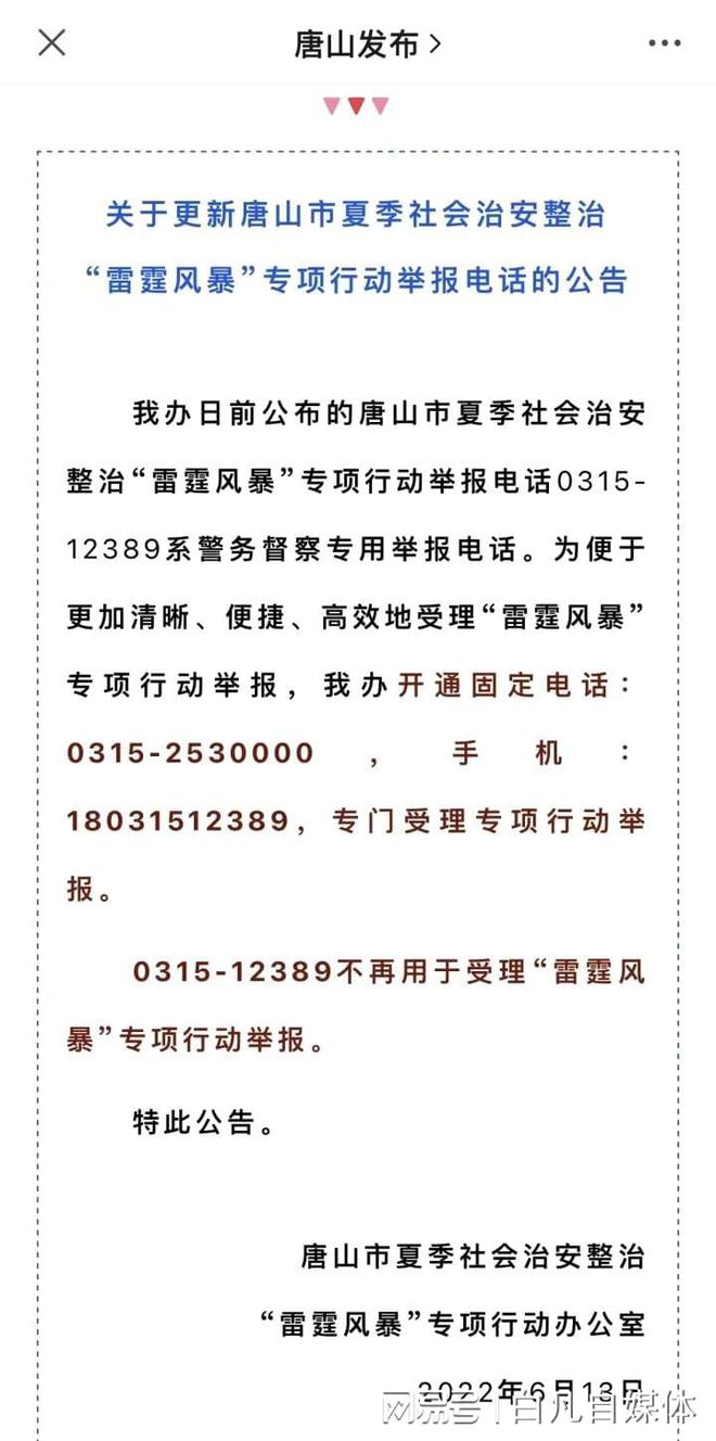 唐山更新举报电话 曾被反映打不通#唐山市夏季社会治安整治“雷霆风暴”专项行动举报电话已变更。警务督察专用举报电话被变更且同时增加了手机号码来处理专项行动举报。此次调整的原因是有市民和记者反映,举报电话打不通。
