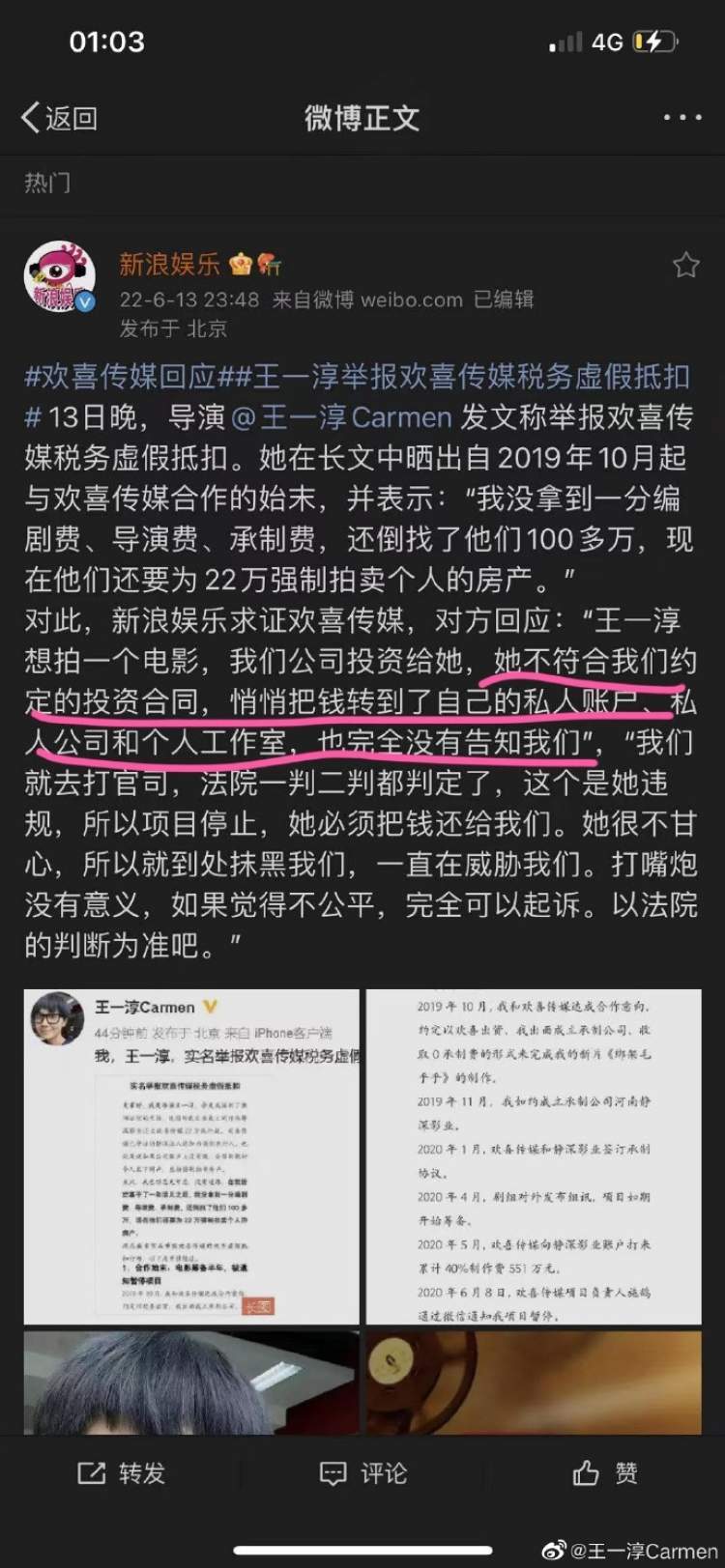 昨晚,导演王一淳在个人微博发文,实名举报欢喜传媒税务虚假抵扣。