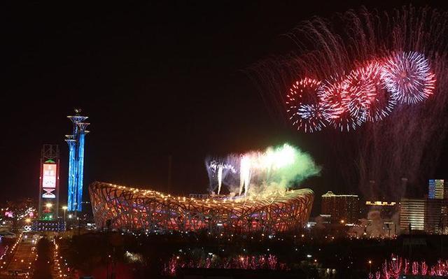 第二十四届冬奥会正式闭幕,鸟巢上空绽放出绚丽的焰火。