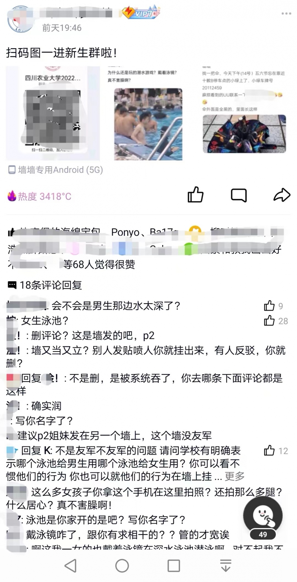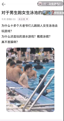 为什么十多个老大爷们跑到女生泳池去玩游戏?还是玩的潜水游戏,真不害臊啊?”这两日,有四川农业大学女生在网上的发文引发热议。