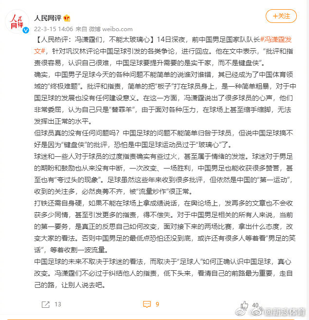 【#人民网评冯潇霆们不能太玻璃心#】对于#冯潇霆发文# 回应@巩汉林 一事,@人民网评 发表评论:批评和指责,简单的把“板子”打在球员身上,是一种简单粗暴,对于中国足球的发展也没有任何建设意义。但球员真的没有任何问题吗?中国足球的问题不能简单归咎于球员,但说中国足球搞不好是因为“键盘侠”的批评,恐怕是中国足球运动员过于“玻璃心”了。