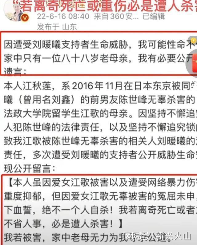 6月16日,江歌的母亲江秋莲再次在网上露面发声,立下毒誓,称自己被刘暖曦(原名刘鑫)的粉丝威胁,江秋莲称,她虽然遭遇网暴,情绪抑郁,但是她不会为此自杀,不会放弃为女儿和自己讨回公道,直到对方得到应有的惩罚。如果自己莫名其妙的离世,或者受了重伤,绝对不是自己自杀,可以断定是“某些人”的所作所为,因家中8旬老母亲年纪已老,到时请相关部门帮自己进行公诉。