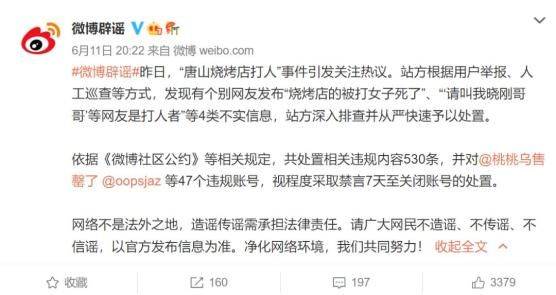 在6月11日,微博辟谣官方帐号就曾发布过辟谣博文。文中称,根据用户举报、人工巡查等方式,发现有个别网友发布“烧烤店的被打女子死了”、“‘请叫我晓刚哥哥’等网友是打人者”等4类不实信息,站方深入排查并从严快速予以处置。