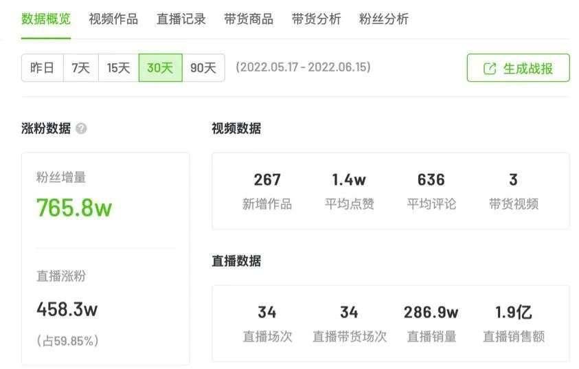 当然,东方甄选直播间、新东方老师董宇辉是 618 最大黑马。据飞瓜数据显示,东方甄选直播间近一个月涨粉 765 万,直播销售额 1.9 亿元,但与其数据区间相近(或高出)的达人并不少。交个朋友直播间为 3.3 亿元,广东夫妇为 4.1 亿元,贾乃亮为 2.9 亿元。