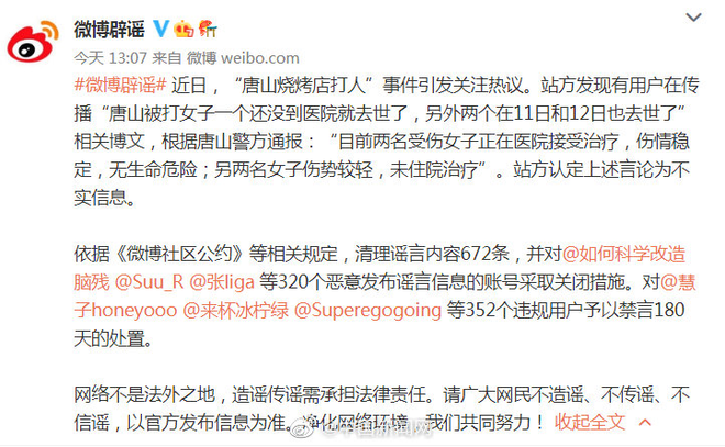 依据《微博社区公约》等相关规定,清理谣言内容672条,并对@如何科学改造脑残 @Suu_R @张liga 等320个恶意发布谣言信息的账号采取关闭措施。对@慧子honeyooo @来杯冰柠绿 @Superegogoing 等352个违规用户予以禁言180天的处置。