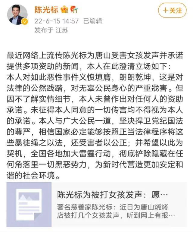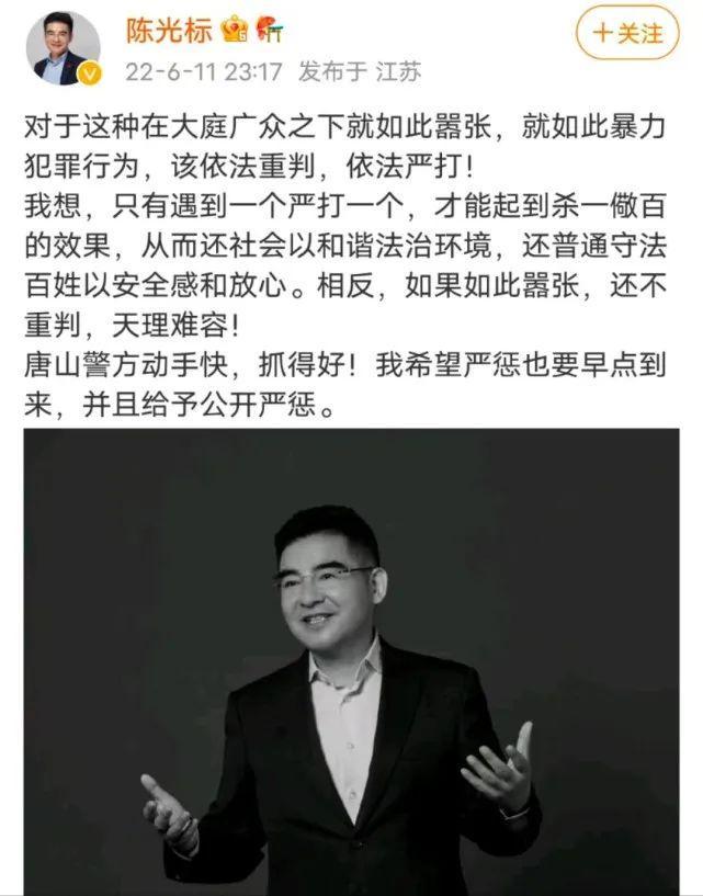 不少公众人物也曾为唐山打人事件发声。“中国首善”陈光标是其中之一。