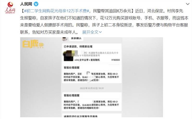 民警称,孩子上初二本身较叛逆,事发后警方便与购物平台客服联系,告知对方买家是未成年人。经多天反复协调,除手机等物品已被使用无法退还外,平台将充值游戏的钱依法一笔笔地退还,目前已退款6万余元。