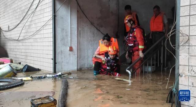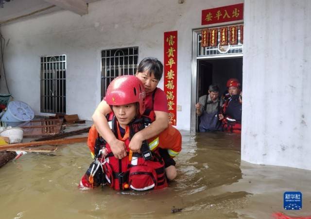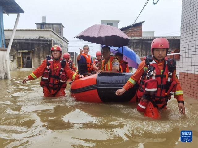 6月21日,在广东韶关市曲江区,消防救援人员转移被困群众。受持续强降雨影响,广东省韶关市三防指挥部决定于6月21日7时将防汛Ⅱ级应急响应提升为防汛Ⅰ级应急响应。 新华社发(邓建龙 摄)