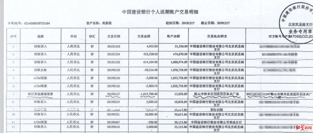 银行流水显示,2019年1月27日,肖老持有的本人名下尾号为1164的建设银行储蓄卡,有一笔1015700元人民币的支出,收款方为鞍山市铁东区某家具广场,收款账号尾号为1547。