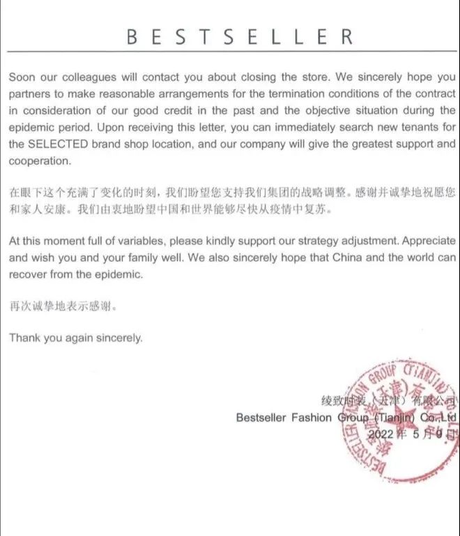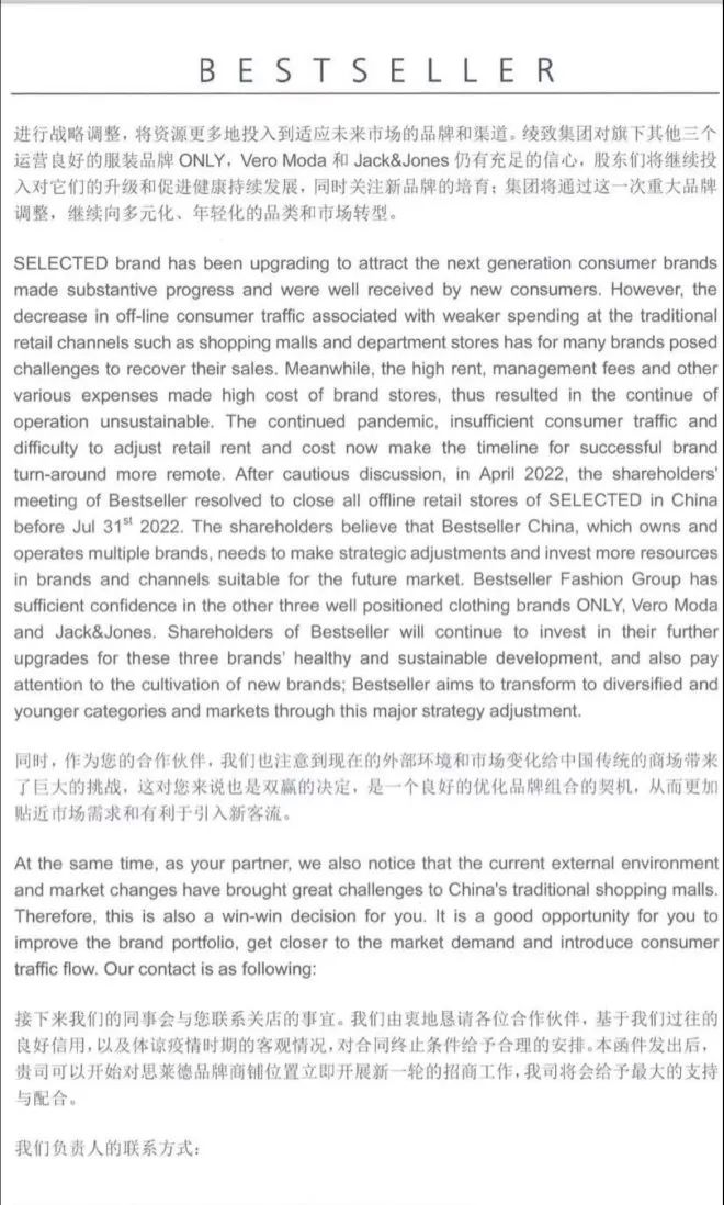 5月9日,绫致时装发布思莱德终止零售业务告知函:2022年4月,绫致股东会做出重要决定,将于今年7月31日前关闭思莱德在中国的所有零售店铺。