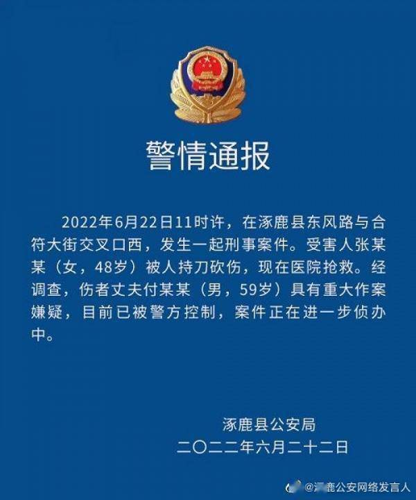 央视网消息:@涿鹿公安网络发言人22日消息,河北涿鹿公安通报,6月22日11时许,在涿鹿县东风路与合符大街交叉口西,发生一起刑事案件。受害人张某某(女,48岁)被人持刀砍伤,现在医院抢救。经调查,伤者丈夫付某某(男,59岁)具有重大作案嫌疑,目前已被警方控制,案件正在进一步侦办中。