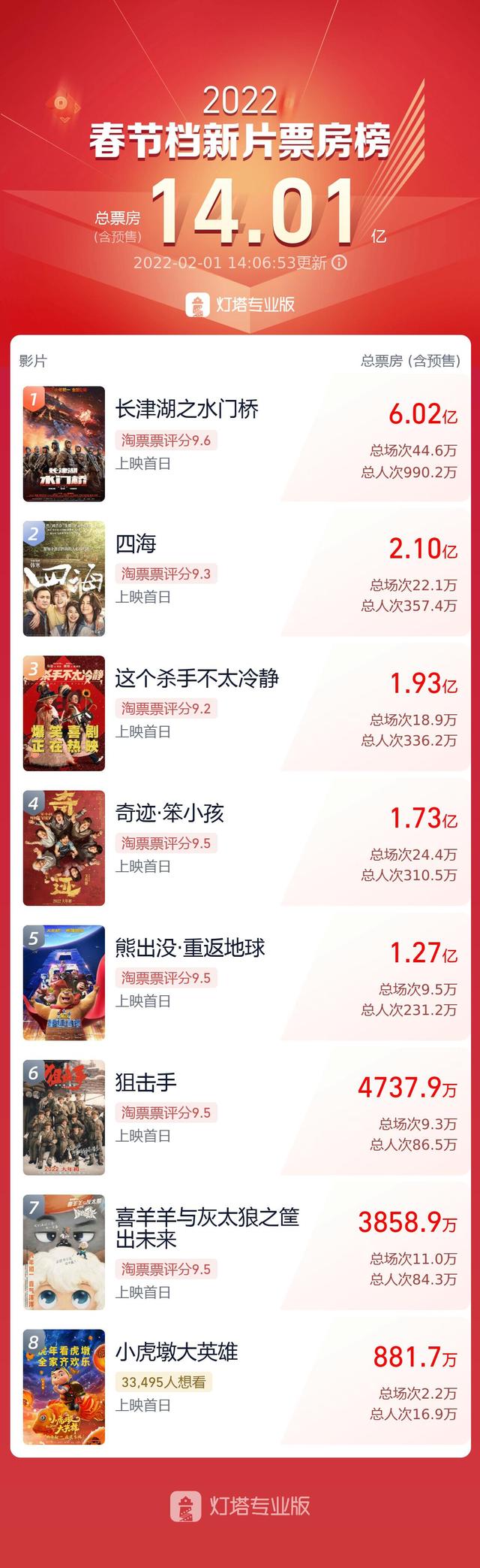 新京报讯(记者周慧晓婉)据灯塔专业版实时数据,截至2月1日14时06分,2022春节档新片(含预售)总票房已突破14亿元。另外,截至13时52分,《长津湖之水门桥》实时票房破5亿元,助力演员朱亚文主演电影票房破百亿。