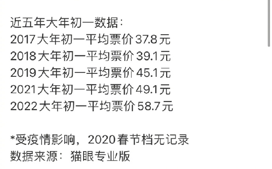 新浪娱乐讯 2022虎年春节档拉开帷幕,据猫眼专业版显示,大年初一平均票价达58.7元(含服务费),相较于2021大年初一49.1元的平均票价,涨幅接近20%,而大年初二、初三的平均票价更是超过60元,最高达62.5元。