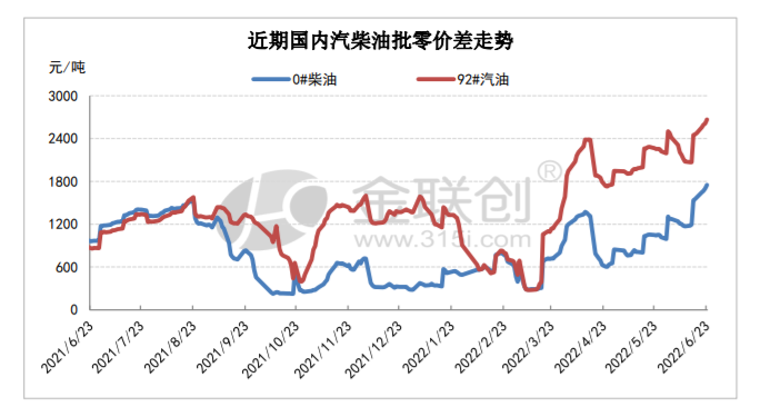 然而,国内汽柴油批发行情维持下行趋势的同时,其零售利润仍呈现稳中有增。金联创数据显示,截至6月23日,国内92号汽油的平均零售利润为2669元/吨,较6月16日上涨209元/吨;0号柴油平均零售利润为1750元/吨,较6月16日上涨198 元/吨。对此,王珊告诉记者,上述现象的主要原因是在消息面利空施压的同时,供需端难寻利好支撑。“由于部分炼厂的相继复工令地炼开工率明显攀高,国内汽柴油资源供应呈增加态势。与此同时,南方地区强降雨频繁,部分地区遭遇洪涝灾害,物流、户外基建项目开展局部受阻令柴油需求持续转淡。”王珊表示,6月28日,国内成品油零售价下调为大概率事件,预计批发市场跌幅不及零售,因此下周汽柴油的批零价差或小幅收窄。