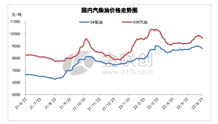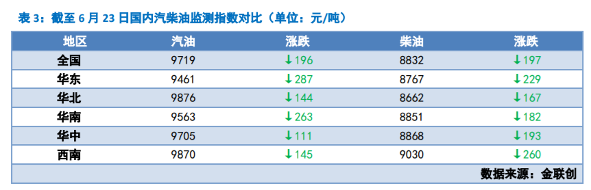 而在本轮成品油价格调整前,全国汽柴油批发价格已处于下行通道。金联创数据显示,截至6月23日,全国92号汽油均价为每吨9719 元,较6月16日每吨下跌196 元;95号汽油均价为每吨9987元,较6月16日每吨下跌201 元;0号柴油均价为每吨8832元,较6月16日每吨下跌197 元。