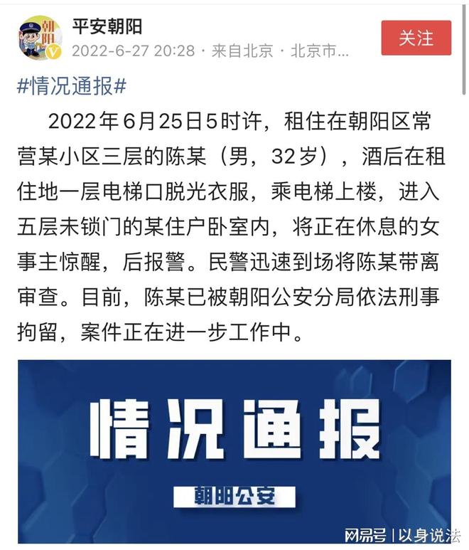 报警后,该男子被警方带走调查。据悉,该男子原来是某云社旗下的演艺人员,叫陈某,今年32岁。其本来住在该楼的3楼,其当时去14楼喝酒后,下楼时就脱光了自己身上的衣裤,随后来到五楼进入女子的卧室。