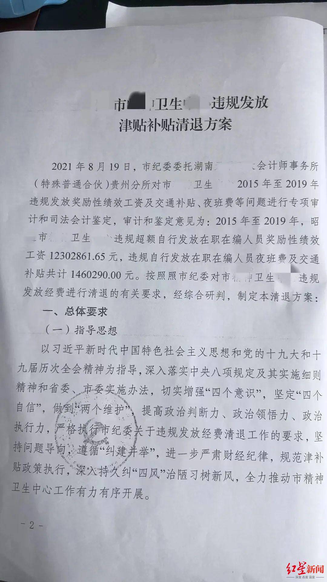 文章中一张“违规发放津贴补贴清退方案”的配图显示,市纪委委托某会计师事务所对市xx卫生xx2015年至2019年违规发放奖励性绩效工资及交通补贴、夜班费等问题进行专项审计和司法会计鉴定,审计和鉴定意见为:2015年至2019年,昭x市xx卫生xx违规超额自行发放在职在编人员奖励性绩效工资12302861.65元,违规自行发放在职在编人员夜班费及交通补贴共计1460290元。