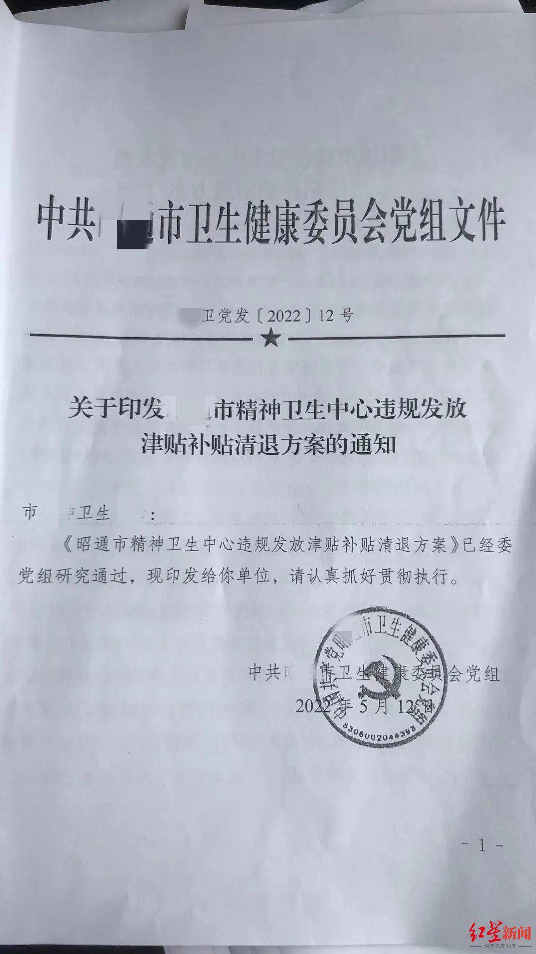 红星新闻记者注意到,另一张《关于印发xx市精神卫生中心违规发放津贴补贴清退方案的通知》的配图中显示,《昭通市精神卫生中心违规发放津贴补贴清退方案》已经委党组研究通过,现印发给你单位。上述所涉单位疑似为昭通市精神卫生中心。