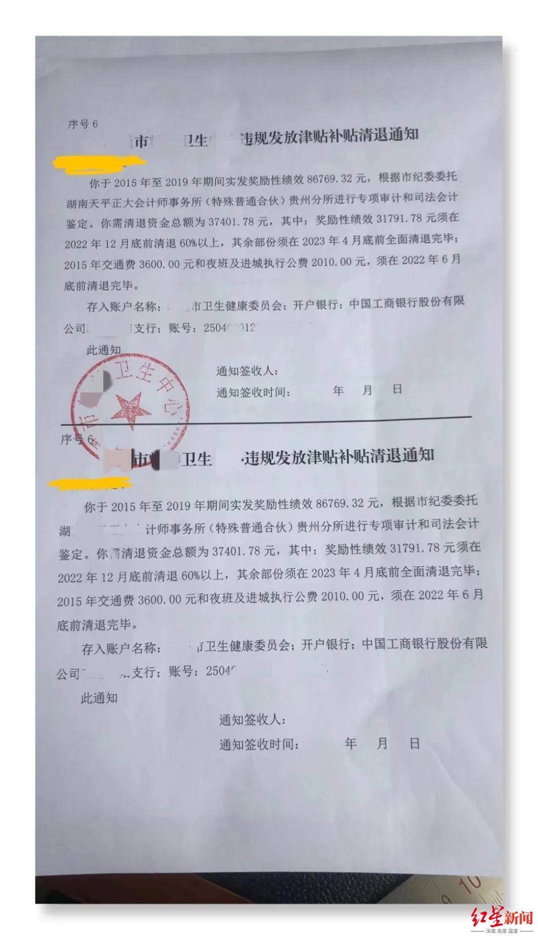另一张“违规发放津贴补贴清退通知”的配图显示,一人于2015年至2019期间实发奖励性绩效86769.32元,需清退资金总额为37401.78元,其中奖励性绩效31791.78元须在2022年12月底前清退60%以上,其余部份(分)须在2023年4月底前全面清退完毕;2015年交通费3600元和夜班及进场执行公费2010元,须在2022年6月底前清退完毕。