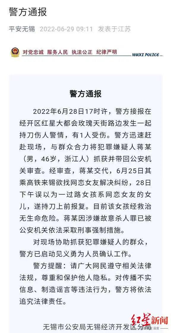 29日上午,记者多次联系上述医院,均未果。据无锡警方发布的相关通报显示,经审查,犯罪嫌疑人蒋某(男,46岁,浙江人)交代,6月25日其乘高铁来锡欲找网恋女友解决纠纷,28日下午误以为一过路女孩系网恋女友的女儿,遂持刀上前报复。目前该女孩经救治无生命危险。蒋某因涉嫌故意杀人罪已被公安机关依法采取刑事强制措施。对现场协助抓获犯罪嫌疑人的群众,警方已启动见义勇为人员确认工作。