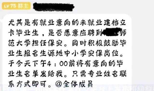 6月30日,据澎湃新闻视频报道:6月24日,安徽一位同学发布班级群聊截图,照片显示该校招本校学生当本校保安,当天16时截止报名,并鼓励学生应聘生源地中小学安保岗位。