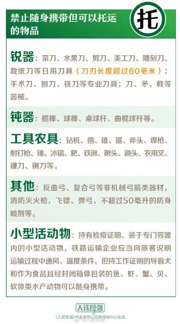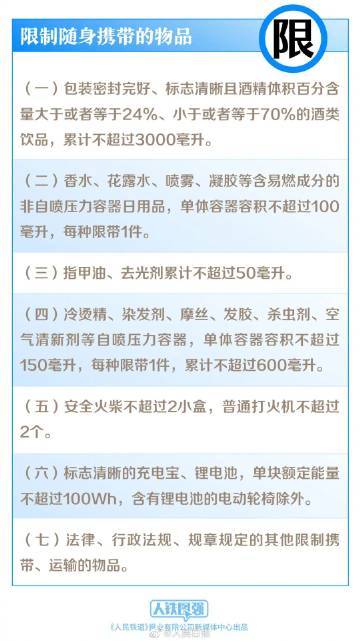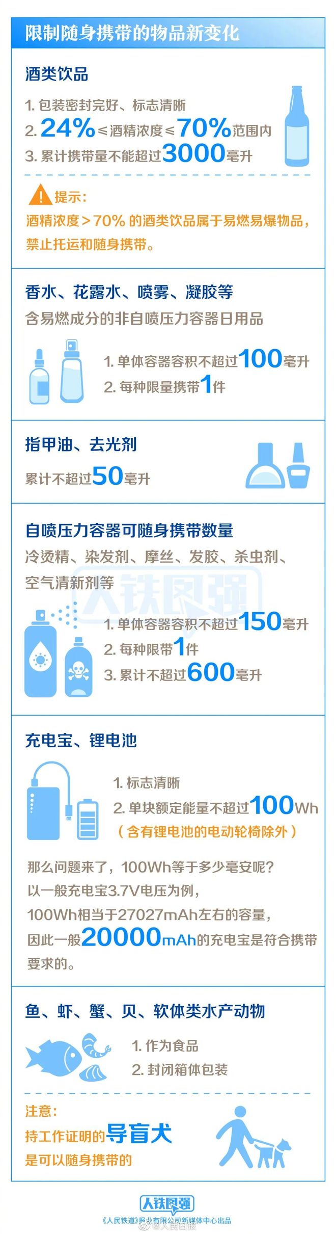 最新版《铁路旅客禁止、限制携带和托运物品目录》2022年7月1日起施行。新目录规定:①酒类饮品包装密封须完好、标志清晰,24%≤酒精浓度≤70%范围内,累计携带量不能超过3000毫升;②#明起坐火车带充电宝有容量限制#:单块额定能量不超过100Wh…