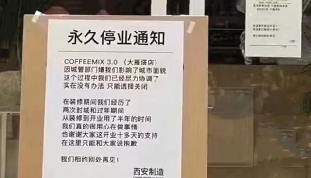 图文显示,西安COFFEEMIX3.0(大雁塔店)因为城管部门嫌弃店铺门头影响了城市面貌,咖啡店也尽力协调了,实在没有办法,只能选择关闭。