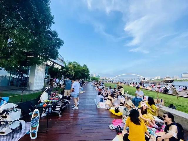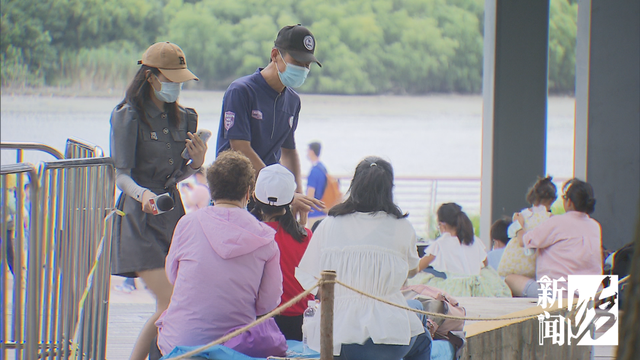 除了近郊海边游,市区的滨江附近也成了市民们游玩的热门地,不少人甚至带了帐篷、地垫等装备。
