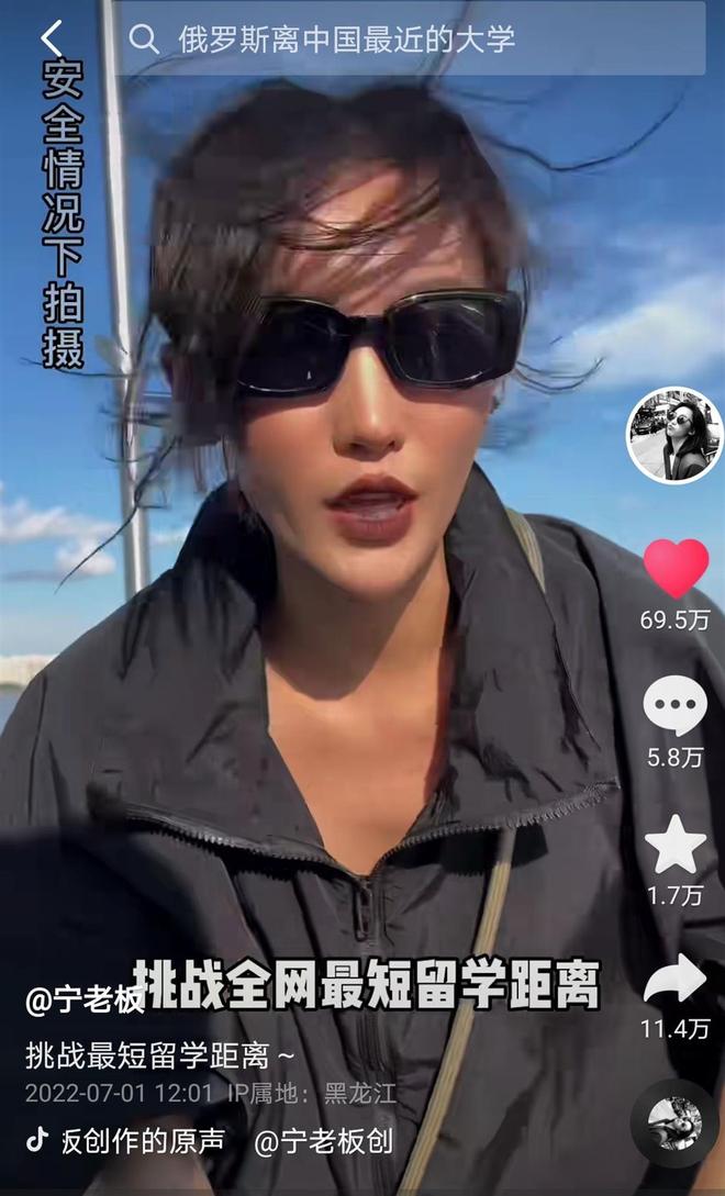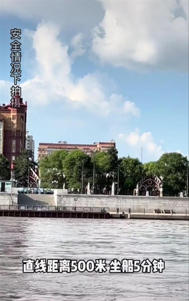 网传视频显示,一名戴着墨镜的女子站在一条船上,指着岸上一栋白色建筑称,那是自己中国的家。镜头一转,她又指着江对面一栋红色俄式建筑称,那就是自己俄罗斯留学的学校,直线距离约500米,坐船约5分钟,并称“挑战全网最短留学距离”。