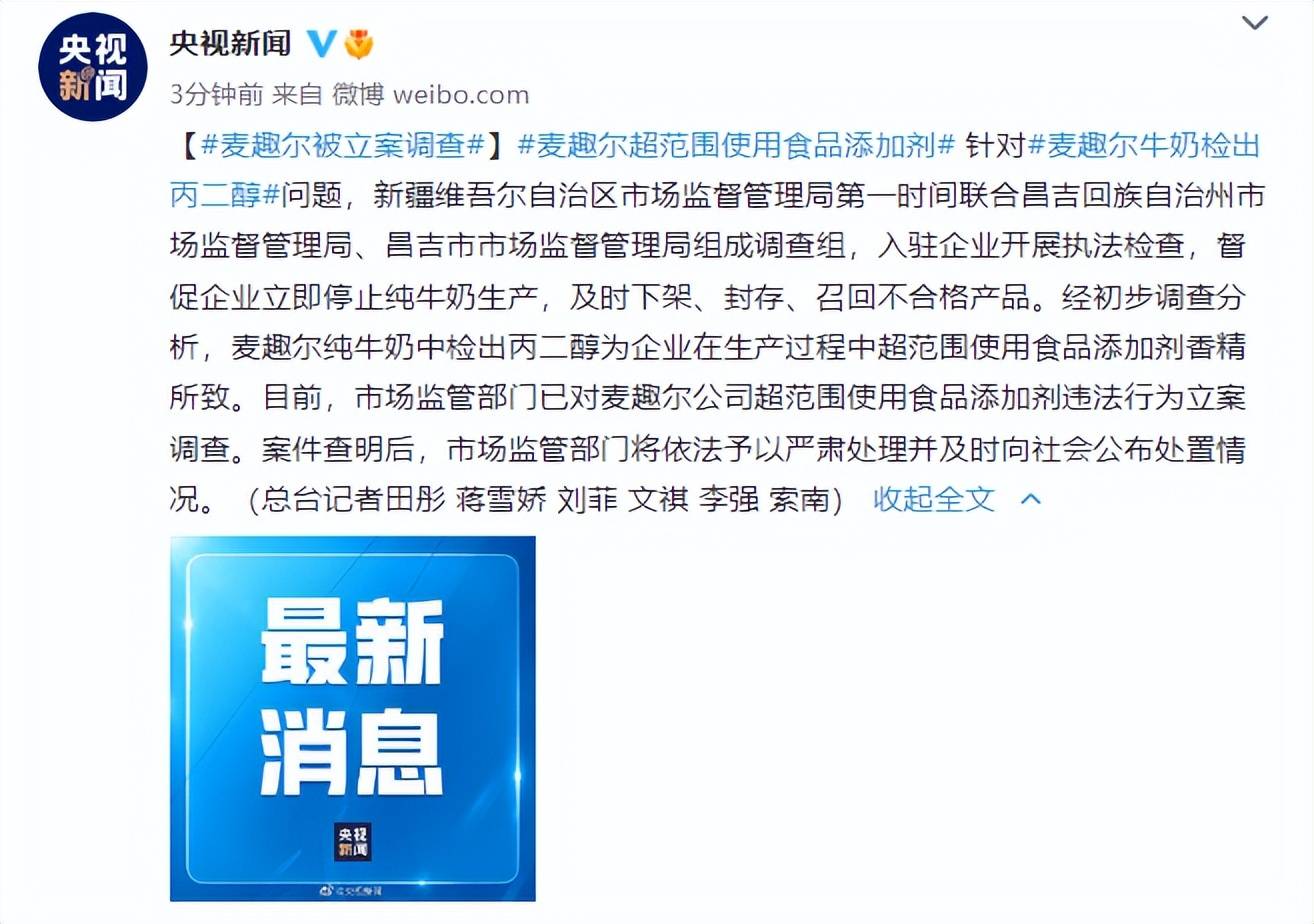 针对麦趣尔牛奶检出丙二醇问题,新疆维吾尔自治区市场监督管理局第一时间联合昌吉回族自治州市场监督管理局、昌吉市市场监督管理局组成调查组,入驻企业开展执法检查,督促企业立即停止纯牛奶生产,及时下架、封存、召回不合格产品。经初步调查分析,麦趣尔纯牛奶中检出丙二醇为企业在生产过程中超范围使用食品添加剂香精所致。目前,市场监管部门已对麦趣尔公司超范围使用食品添加剂违法行为立案调查。案件查明后,市场监管部门将依法予以严肃处理并及时向社会公布处置情况。(总台记者田彤 蒋雪娇 刘菲 文祺 李强 索南)