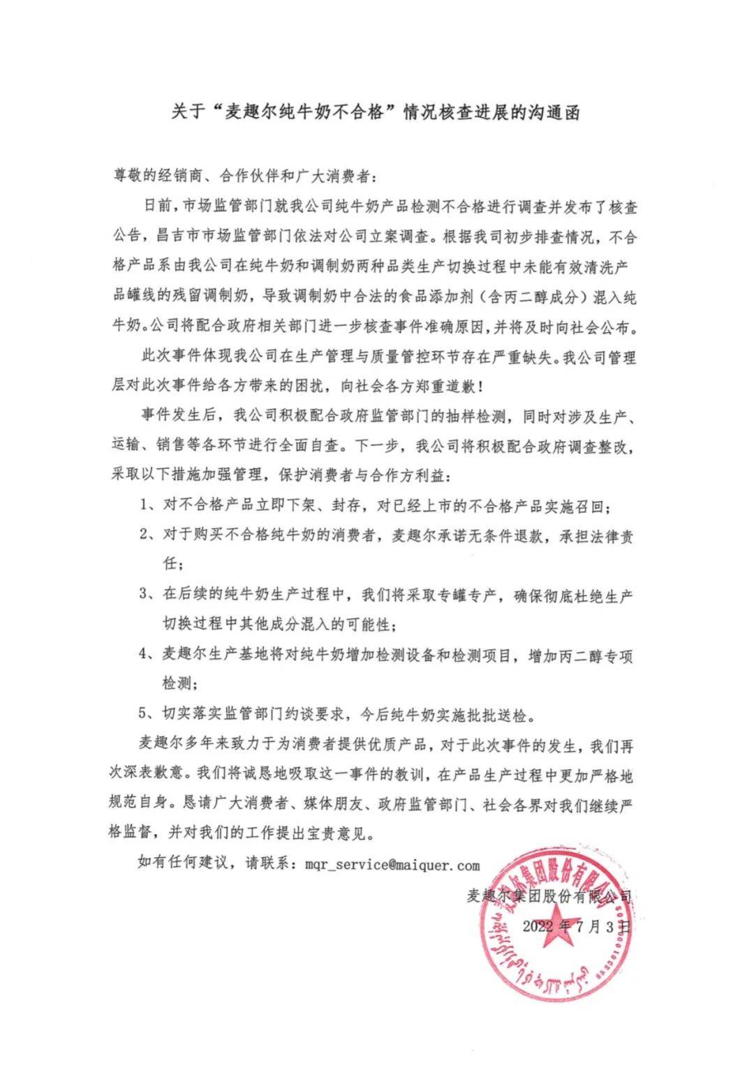 7月3日,微信公众号“麦趣尔乳业”发布关于"麦趣尔纯牛奶不合格"情况核查进展的沟通函,