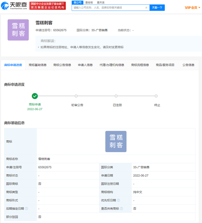 中国经济周刊-经济网讯 天眼查App显示,近日,“雪糕刺客”商标被自然人李某申请注册,国际分类为广告销售,当前商标进度为申请中。
