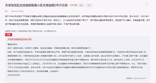 天津宝坻区信访办公室在6月8日的一条回复中表示,由于该项目外省市工人较多,返津复工成本较高,因此该项目未全面复工,2022年4月1日,项目方已安排部分非疫区工人进场施工。同时,区住建委与京津新城管委会、项目方与海棠雅著项目部多次召开复工复产专题推动会,会议决定由区住建委向市住建委申请解封海棠雅著项目900万元监管资金作为项目方复工前期准备资金,争取早日交房。