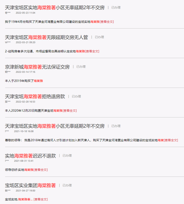 自2020年起,人民网(10.570, -0.17, -1.58%)领导留言板上关于反映海棠雅著项目延期交房的留言近20条。