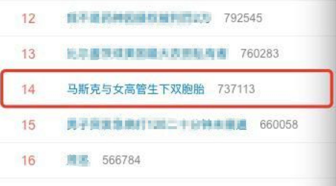 不久后,马斯克与女高管生下双胞胎登上平台热搜,引发网友讨论。