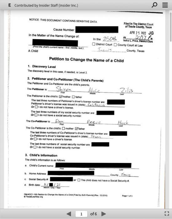 据悉,马斯克和齐利斯提交了一份关于更改双胞胎婴儿的请愿书,而齐利斯是于2021年11 月分娩的。