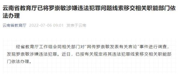7月6日,云南省教育厅发布消息,经省教育厅工作组会同相关部门对“网传罗崇敏发表有关言论”事件进行调查,发现罗崇敏涉嫌违法犯罪。近日,已按有关规定将其违法犯罪线索移交相关职能部门依法办理。