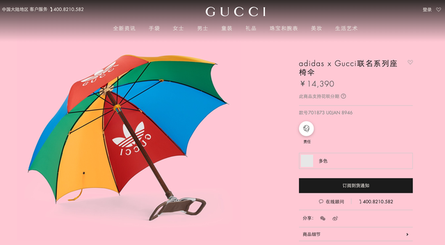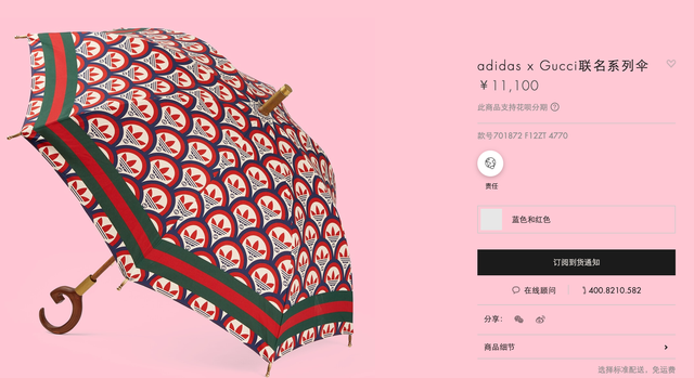 近日,奢侈品牌古驰(Gucci)和运动品牌阿迪达斯(Adidas)合作推出联名伞。