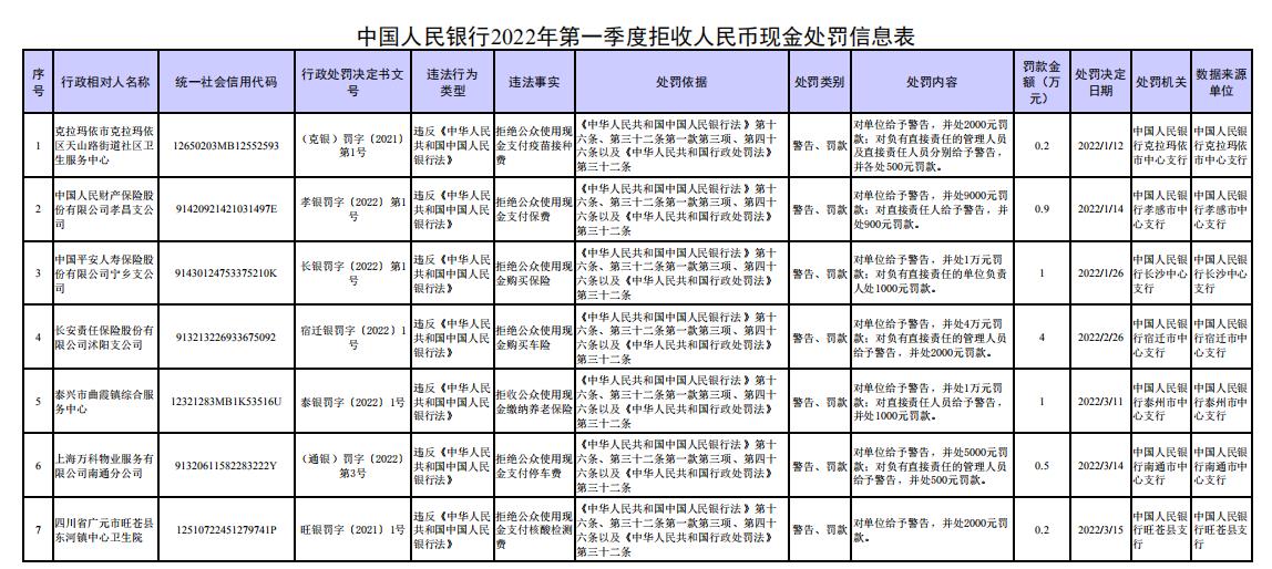 2022年第一季度,人民银行依法对7家拒收现金的单位及相关责任人作出经济处罚,处罚金额从2000元至4万元人民币不等。被处罚的单位包括便民服务中心等公共服务机构以及停车场、保险公司、医疗机构等。