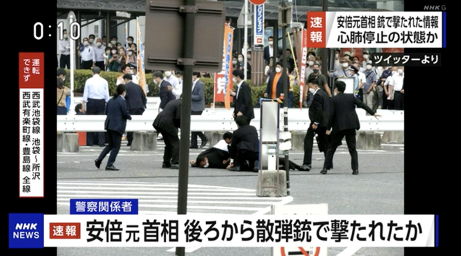 共同社报道,一名不明身份的男子从背后朝安倍开枪,安倍中弹倒地。