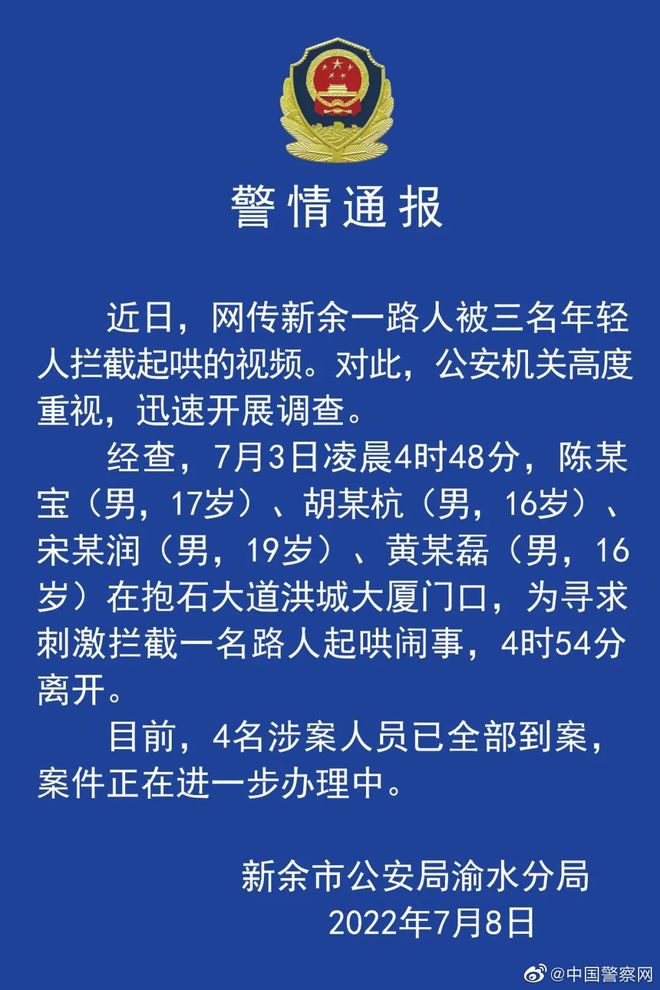 7月9日,江西新余警方发布警情通报:近日,网传新余一路人被三名年轻人拦截起哄的视频。对此,公安机关高度重视,迅速开展调查。经查,7月3日凌晨4时48分,陈某宝(男,17岁)、胡某杭(男,16岁)、宋某润(男,19岁)、黄某磊(男,16岁)在抱石大道洪城大厦门口,为寻求刺激拦截一名路人起哄闹事,4时54分离开。目前,4名涉案人员已全部到案,案件正在进一步办理中。