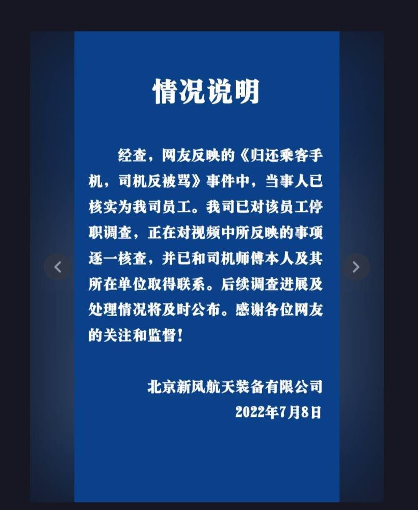 据中国航天科工集团有限公司官方抖音7月8日下午消息,北京新风航天装备有限公司(简称“新风航天”)当天发布情况说明,回应了网友反映的“归还乘客手机 司机反被骂”一事。
