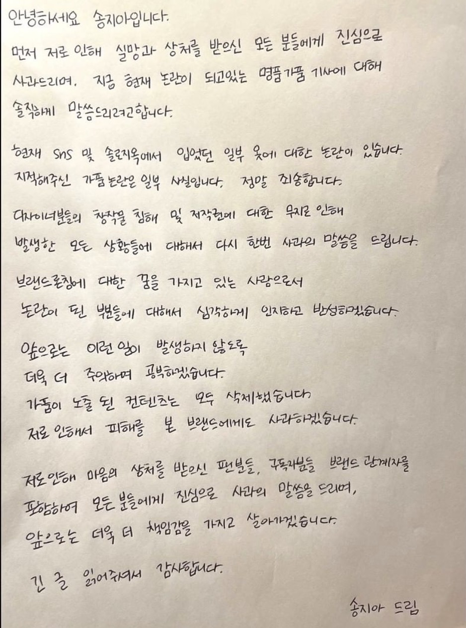 1月17日,宋智雅在社交平台更新动态晒出亲笔信为假货事件道歉: